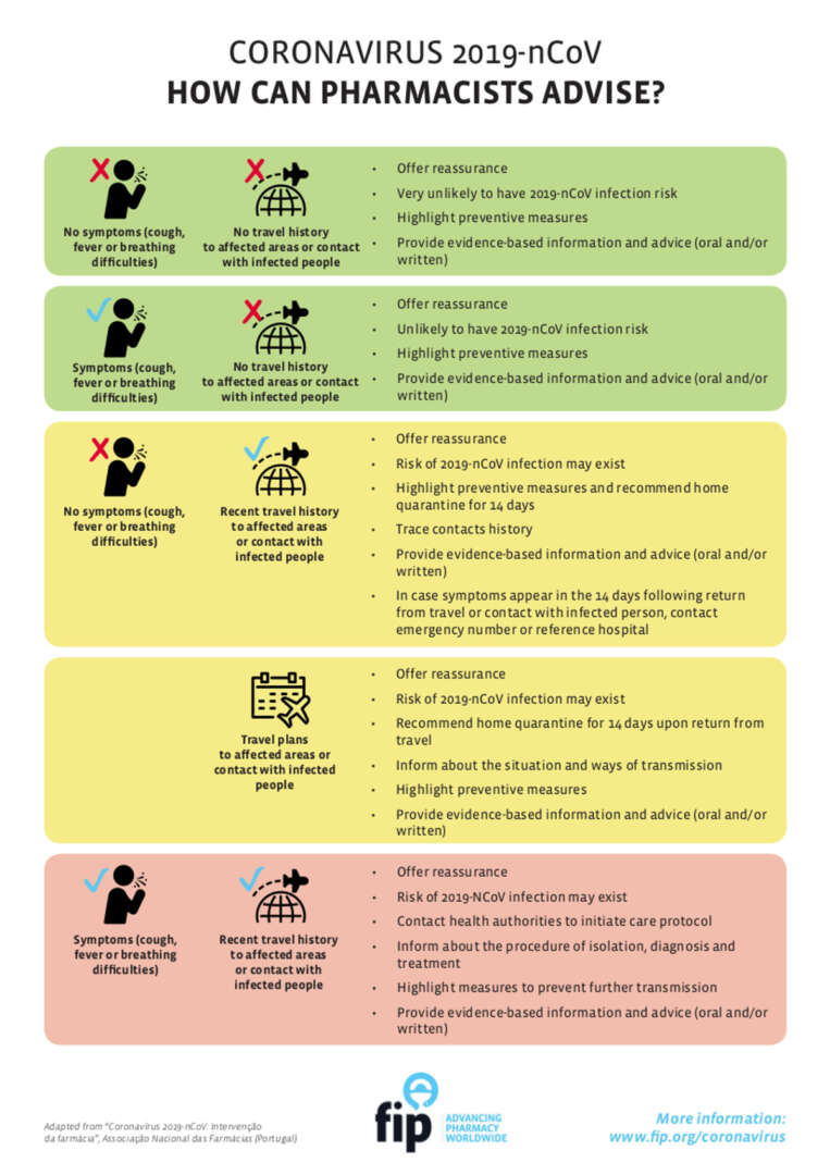 FIP je objavio dokument o ulozi ljekarnika u javnosti i bolnicama čime bi pridonijeli sprječavanju širenja novog koronavirusa 2019-nCoV i učinkovitosti kontrole infekcije od strane zdravstvenog sustava. Dokument je donijela FIP-ova Radna grupa za hitne slučajeve na temelju Deklaracije kojom je WHO proglasio globalno izvanredno stanje.