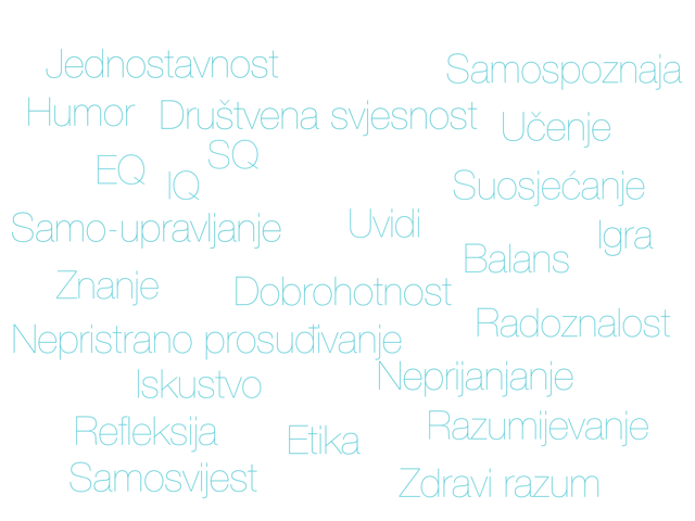 Mudrost uključuje ali i nadrasta stručnost, znanje… Mudrost nećemo dobiti samo time što smo završili formalno školovanje. Jer mudrost uključuje brojne vrste inteligencije (logičku, emocionalnu, socijalnu, duhovnu inteligenciju), iskustvo, uvide, znatiželju, suosjećanje, refleksiju tj. promišljanje, razumijevanje, zdrav razum, nepristrano prosuđivanje, neprosuđivanje, poznavanje sebe, svjesnost o sebi, neprijanjanje, etičnost, dobrohotnost, velikodušnost i brojne još vrline, stalno učenje, razigranost te uz sve nabrojano i – jednostavnost.